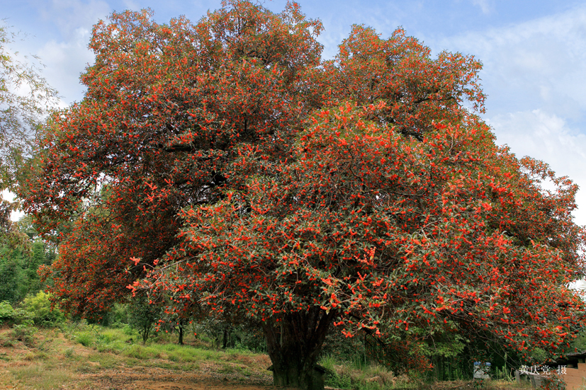 “小臨江,大丹桂”,我的一句口頭禪,臨江鎮實際上是浦城縣的大鄉鎮,是南浦城核心區、交通要沖,說臨江小主要是講管轄的范圍小,我是個徒步狂人,近幾年臨江鎮的農業基礎設施建設神速,鄉間的田間地頭,修筑了許多標準水泥機耕道,我在機耕道上徒步急走,一不小心就走進了外鄉地界。說大丹桂是這里丹桂種植面積大,全鎮100多平方千米,房前屋后、田間地頭,凡是能種樹的地方都種上了丹桂,可謂是寸土寸“丹”,這里的丹桂樹特大,號稱中華第一桂的“九龍桂”就生長在臨江鎮楊柳尖村,丹桂樹是棵狀植物,主干長出地面一米以上分支,九龍桂,是一株樅狀桂花樹,她有九根主干,形式九條龍,號稱“九龍桂”樹高15.6米,冠幅18米,胸圍4.6米,覆蓋范圍230平方米,樹齡超過1100年,年產鮮花240公斤,是目前發現的全國最大的桂花樹,并以“唐桂”收錄《中國桂花集成》。這里的桂花產業大,臨江鎮桂花產業從園林綠化開始起步,臨江鎮的桂花樹株株都高大挺拔,皆為園林綠化首選,“好大一棵樹”,人們首先想到的當然是“九龍桂”,她的名氣實在太大了,臨江鎮村民房前屋后的每一棵桂花樹都稱得上“好大一棵樹”,都是臨江鎮做大桂花產業的好幫手,丹桂從綠化起步,往食品拓展,目前已經研發出高端桂花酒、桂花糕、桂花蜜,還有桂花茶,閩北的兩棵樹在臨江鎮終于強強聯手,臨江鎮茶人胡春友先生已經研發出了桂花紅茶、桂花綠茶,在桂花干花的保香、保色、保質上也頗有建樹。