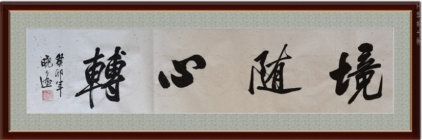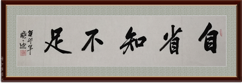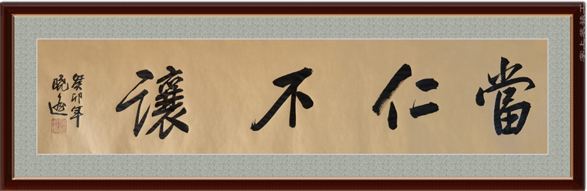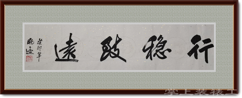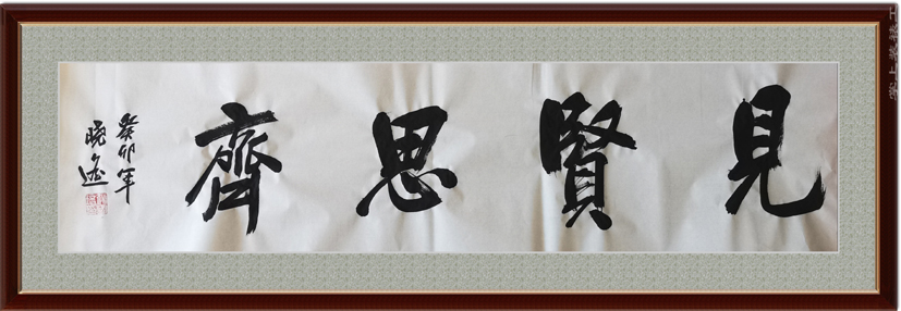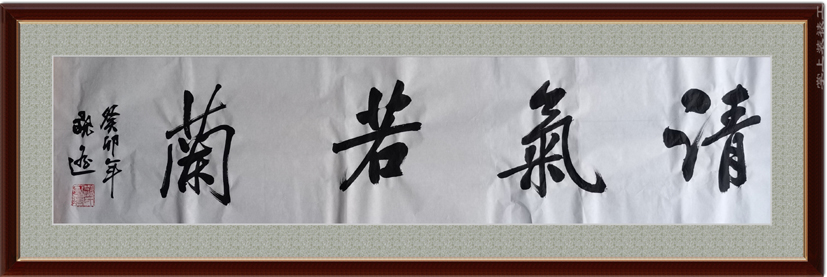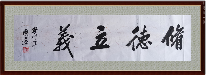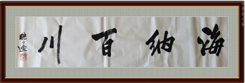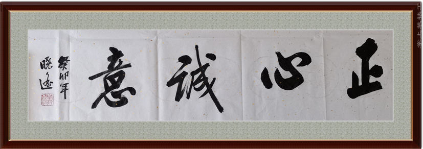 姚國培的書法,從用筆上來看,尤其是他的大字用筆渾厚,用墨非常飽滿。方中帶圓,有一定的魏碑意趣。從結體上來看,姚先生應當是臨習過圣教序和李思訓碑的。圣教序是懷仁集王羲之的字,這個碑是行書里面非常有名的碑,是學習行書的人首先的一個帖子。圣教序的字,結體以欹斜多變著稱,用筆瘦硬勁拔,是王羲之書中集陽剛美與流暢宛轉之勢為一體的代表書風。李思訓碑,同樣也是以用筆瘦硬勁健,結體欹斜開張著稱。相比較而言,李思訓碑的結體欹斜對比更強烈一些,比圣教序的結體更大開大合一些。這種結體,整體上給人的感覺是左低右高,重心不穩,營造出一種突兀拔地而起的氣勢。除外,魏碑中的張猛龍碑也是這種結體的典型代表。宋代的黃庭堅進一步發展了這種欹斜相生,大開大合獨特的書風,形成了長槍大戟,開合對比非常強烈的一種字體。從姚國培的字中可以看到其中上述諸人的影子,這說明他對傳統的碑帖是下過不少功夫的,吸收了多家特點。相比較他的小字,應當說他的大字更好,更加有氣勢,也更為雄渾一些。姚國培的書作,主要是以對聯以及格言警句,四字和六字、七字的對聯行形式多。應當說,姚國培的字如果創作一些長篇形式的作品,也會很不錯的,形式將更豐富多變一些,也更利于字體的多方面布局與表達。
