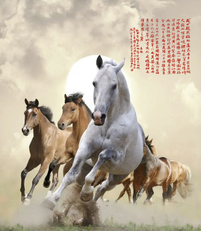 作者巧妙嵌入了干支哲學。“丙是陽火,午主位移”:這八個字是全篇的“文眼”。在五行中,丙火為太陽之光,象征熱烈、光明與能量;午在地支中代表正南方,也含有“震動”“變化”之意。將天干地支的特質(zhì)與馬的形象結合,既點明了寫作的時間節(jié)點(丙午年),又賦予了馬一種烈火燎原、與時偕行的動感,暗示這是一個充滿變革與奮進力量的年份。