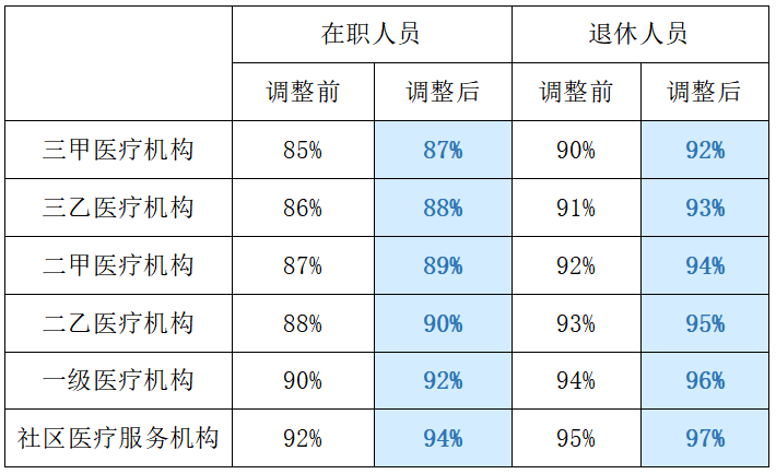 根據(jù)醫(yī)療機(jī)構(gòu)等級(jí)不同,實(shí)行差別化報(bào)銷比例,省本級(jí)職工醫(yī)保住院政策范圍內(nèi)報(bào)銷比例相比原政策提高2個(gè)百分點(diǎn)。